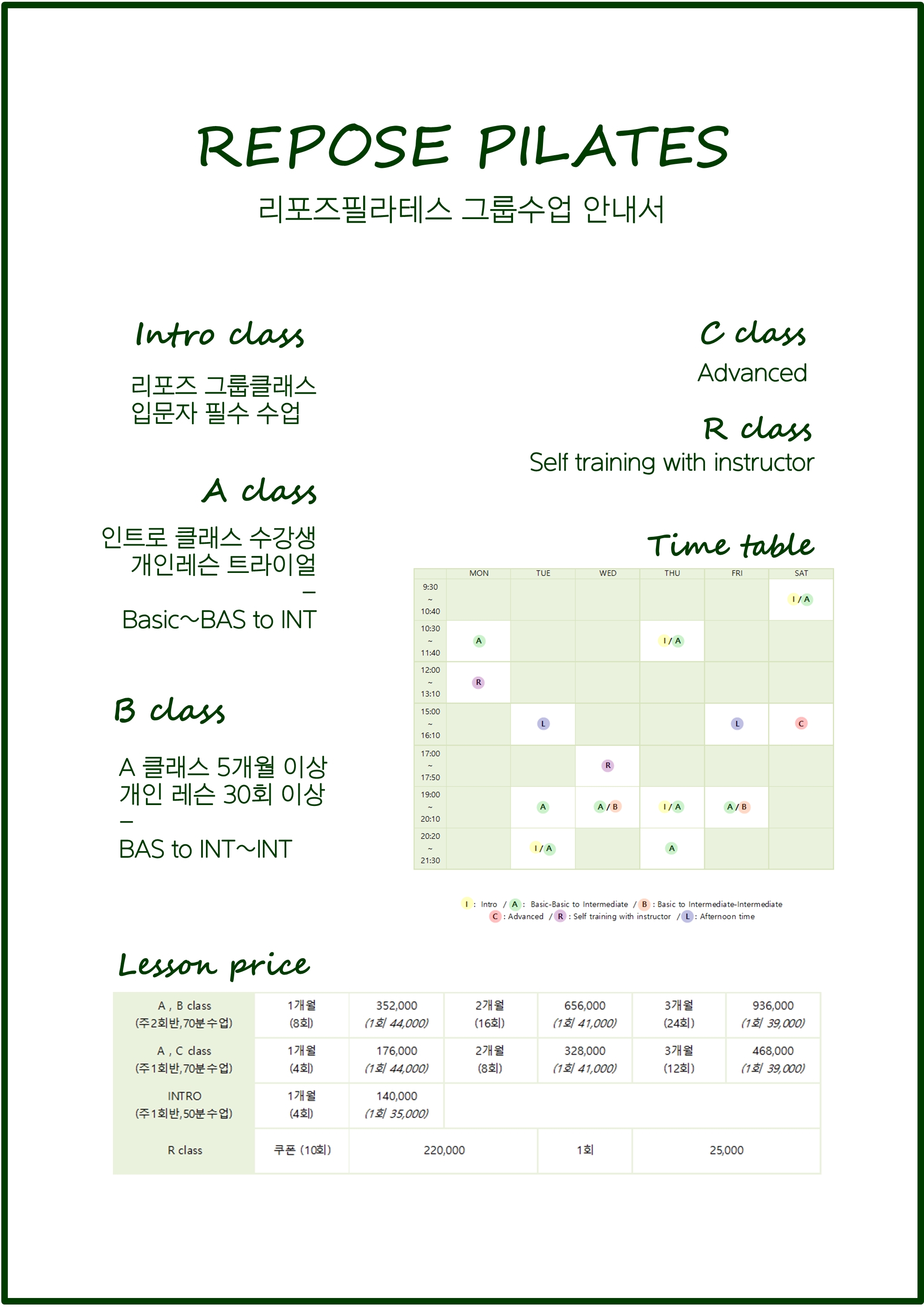 리포즈 소그룹 클래스 타임테이블 추후 지속적으로 새로운 요일과 시간의 그룹 클래스가 개강될 예정입니다. :) 인트로 (Intro) 클래스의 경우 개강 날짜가 정해져 있으니, 리포즈 인스타그램 (@reposepilates) 혹은 블로그 업데이트를 확인해 주세요. * 리포즈 그룹 클래스의 입문자라면 반드시 참석해야 하는 필수 수업입니다! > 이미지를 오른쪽 클릭 후 <새 탭에서 이미지 열기> 를 클릭하시면 큰 화면으로 확인하실 수 있습니다.