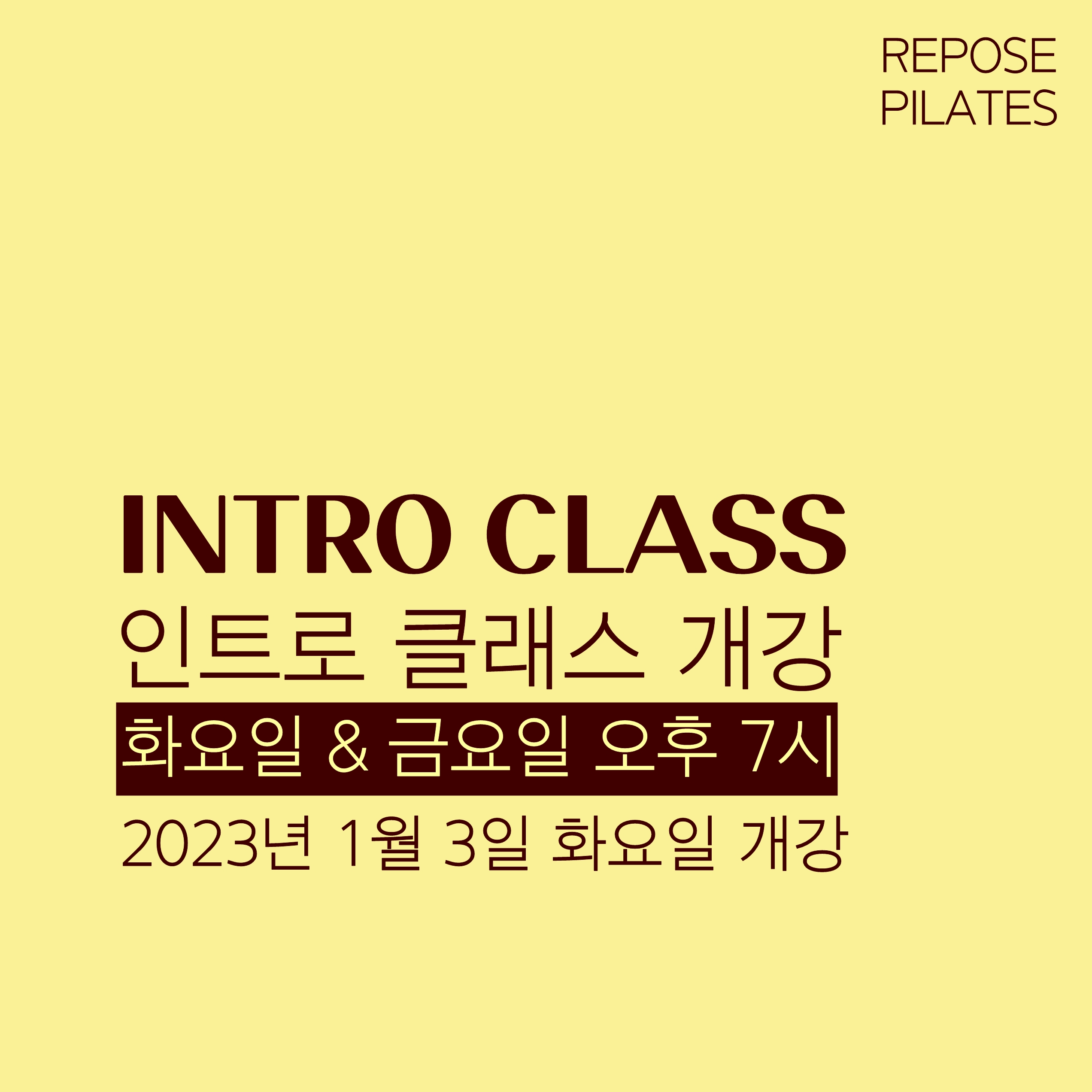 *이미지를 오른쪽 클릭 후 <새 탭에서 이미지 열기> 를 클릭하시면 큰 화면으로 확인하실 수 있습니다.* 리포즈에서 만나는 봄 💌 누구보다 빠르지만 남들과는 다르게 봄을 만날 준비를 시작해보세요.💛 리포즈 그룹 ‘인트로 클래스’는 ▪️필라테스를 처음 경험한다. ▪️필라테스의 경험은 있지만 ‘필라테스의 움직임을 모르겠다.’ ▪️클래식 필라테스에 관심이 있었지만 아직 시작하지 못했다. ▪️클래식 정통기구(그라츠 or 바질)를 처음 접한다. 와 같이 클래식 필라테스 입문자분들께 적합한 수업이며 ‘총 9회’의 수업으로 리포즈 정규 그룹 수업을 들어가시기 전 반드시 참석해야 하는 수업으로 모두에게 열려있는 수업입니다. ▫️화요일 & 금요일 오후 8시 (주2회 클래스) ▫️개강일 : 2023년 3월 3일 금요일 개강 ▫️주 2회 : 50분 수업 : 총 9회 📆 3월 3,7,10,14,17,21,24,28,31일 ▫️정원 : 4명 클래스 등록 및 공석 문의는 리포즈로 부탁드립니다. REPOSE PILATES® K / 리포즈필라테스 C / 02 588 7295 I / @reposepilates A / 서초구 반포대로 14길 26, 8F